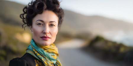 A woman with dark curly hair and a colorful scarf looks directly at the camera with a soft smile.