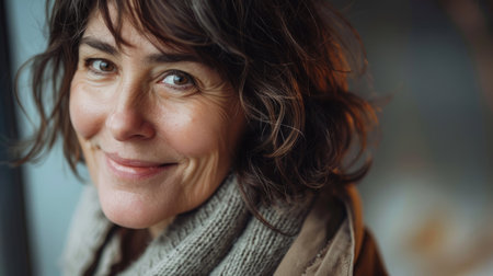Portrait of a smiling middle-aged woman in a warm scarf.