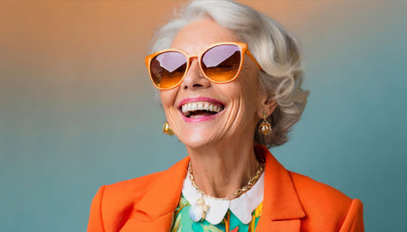 This delightful image captures a happy senior woman dressed in a colorful orange outfit, sporting cool sunglasses. Her infectious laughter and carefree spirit radiate joy, showing the beauty of living life to the fullest at any age.