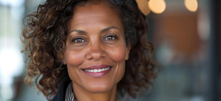 This close-up portrait showcases a woman with curly hair smiling confidently. Her radiant expression and soft lighting highlight her natural beauty and charm.
