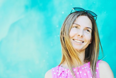 Portrait of a middle aged woman with short ginger hair. She's wearing casual clothes, u-neck sweater. Head and shoulders. Over blue background.