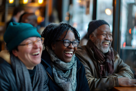 Three mature friends enjoying a lively conversation in a cozy cafe on a cold winter day, laughing and smiling together