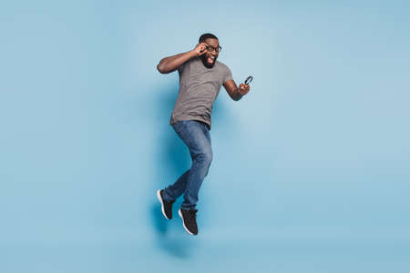Carefree african american man jumping smiling to camera, blue background