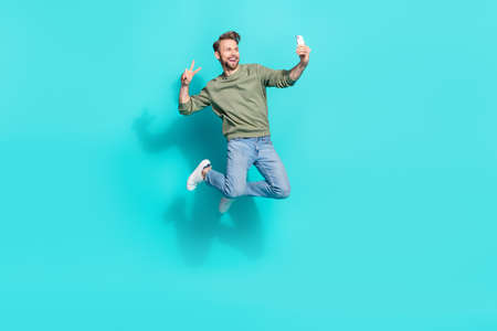 Full length profile photo of crazy blogger man jump hold telephone make selfie wear pullover isolated blue color background