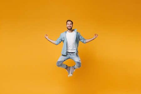 Smiling young bearded man in casual blue shirt posing isolated on yellow orange wall background. People lifestyle concept. Mock up copy space. Jumping hold hands in yoga gesture, relaxing meditating.
