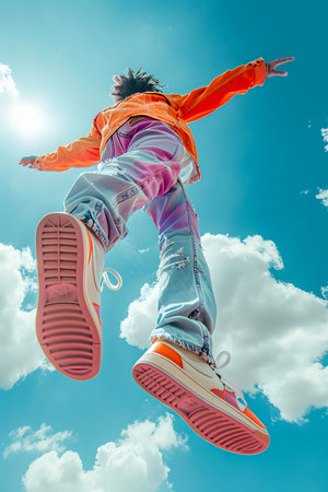 Energetic Jump Against Blue Sky, Youthful Freedom and Excitement Concept