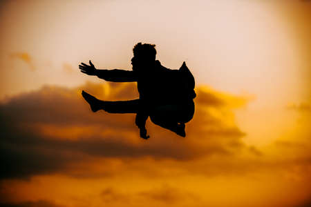 Silhouette of happy joyful young attractive man jumping and having fun against the sunset