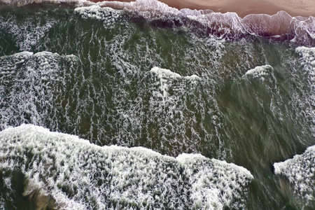 Aerial view Top down Waves crashing on sandy shore,Dark sea surface in summer day background,Seascape top view waves