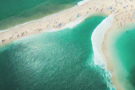 This image captures an aerial perspective of dynamic ocean waves crashing onto a pristine sandy beach, showcasing clear, rhythmic patterns and vivid colors that evoke a sense of tranquility and natural beauty encapsulated within the seascape.