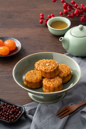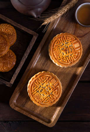 Delicious Cantonese moon cake for Mid-Autumn Festival food mooncake on wooden table background for afternoon tea, holiday celebration serving.