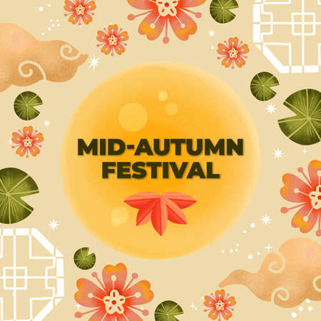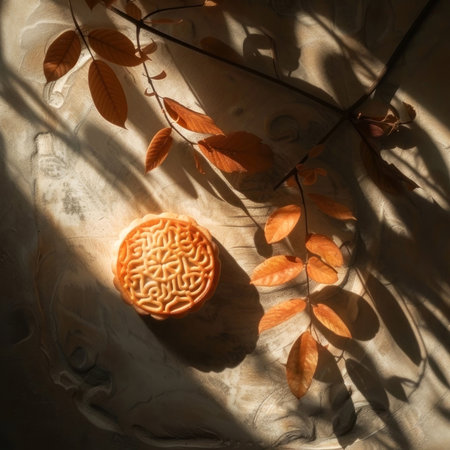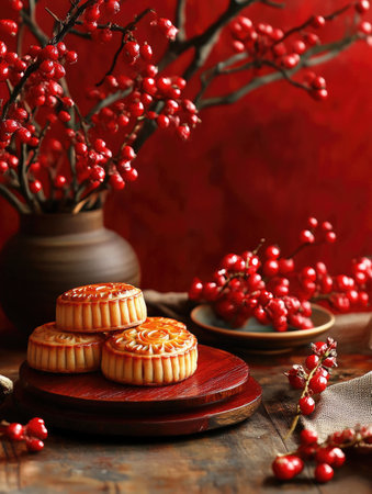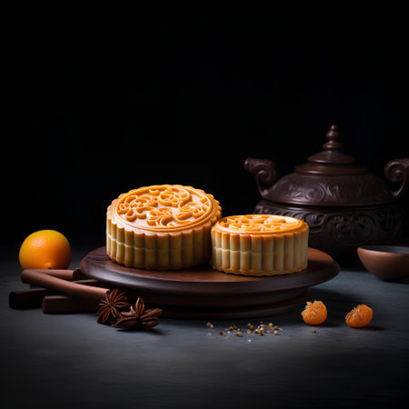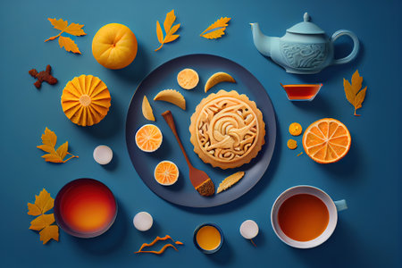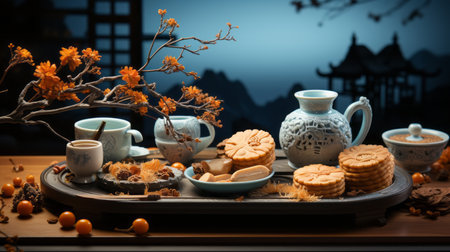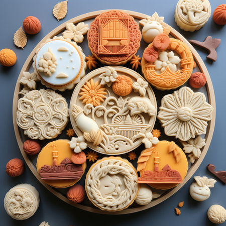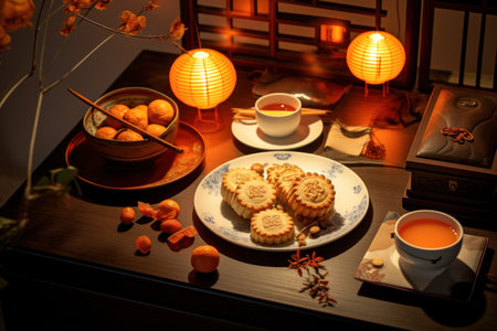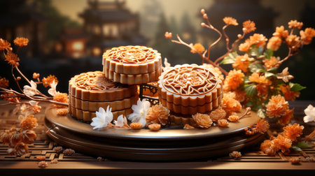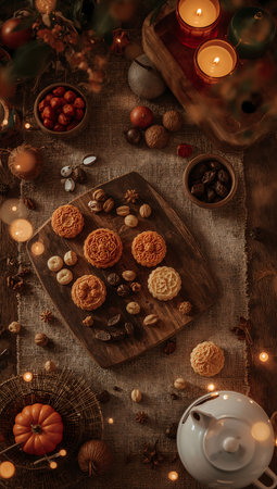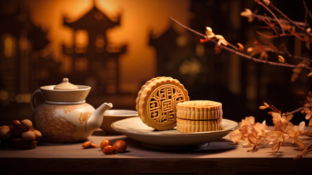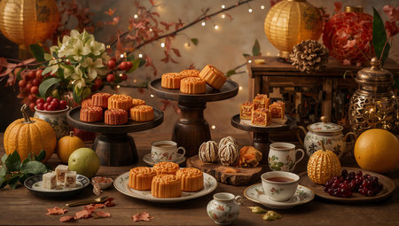 Autumn festival celebration with traditional mooncakes and decor for seasonal festivity