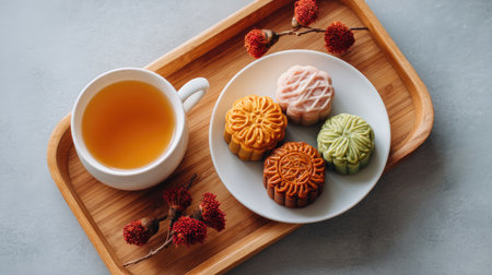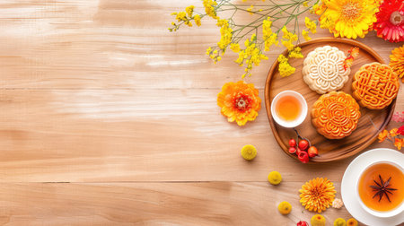 This image features traditional mooncakes arranged on a wooden table alongside tea and colorful flowers, perfect for a Mid-Autumn Festival celebration.