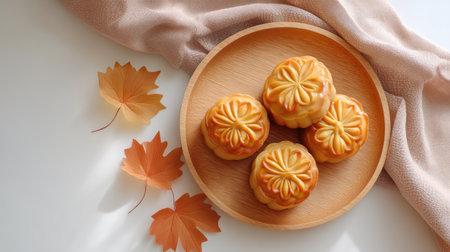 This visually appealing image features an exquisite arrangement of mooncakes on a wooden plate, complemented by soft autumn leaves and fabric, perfect for seasonal festivities.