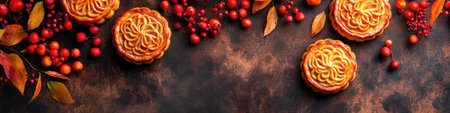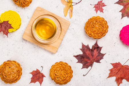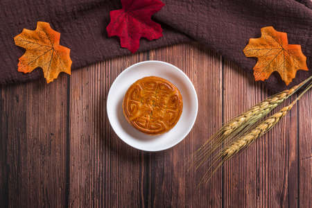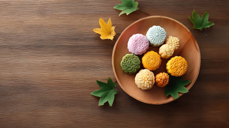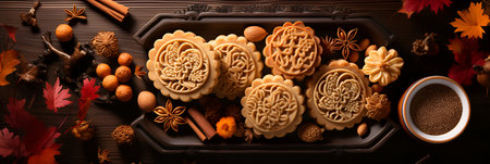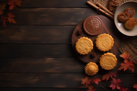 Autumn festival celebration with mooncakes and autumn leaves on rustic background