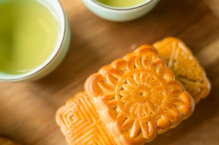 Moon cakes and tea on wooden table, Chinese mid autumn festival food