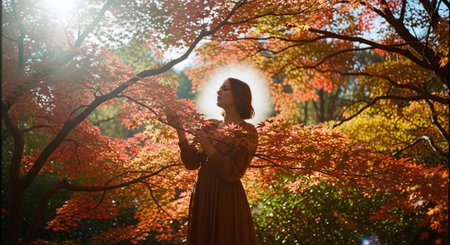Dreamy beautiful girl with long natural black hair on autumn background with colorful leaves in bokeh. Girl enjoys nature in autumn forest. Inspired girl surrounded by vivid foliage. View from back.