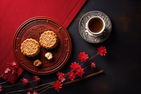 Moon cakes at mid autumn festival. Background food and drink tea and Mooncakes, copy space