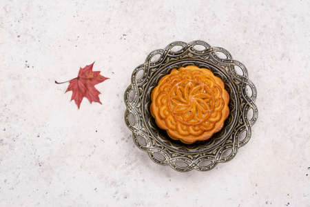 Delicious mung bean moon cake for Mid-Autumn Festival food mooncake on gray table background for afternoon tea, holiday celebration serving.