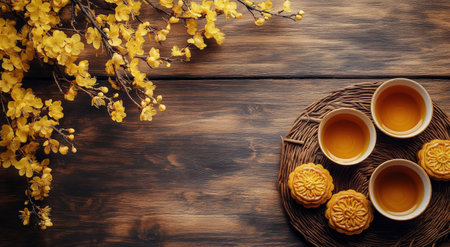 A delightful arrangement features traditional mooncakes alongside small tea cups, accompanied by vibrant yellow flowers, all placed on a textured wooden surface. This setup creates a warm, inviting atmosphere.