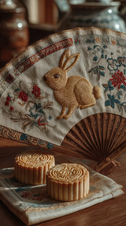 Mid-Autumn Festival moon cake with rabbit and hand fan.