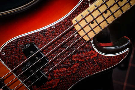 fragment of musical instruments.electronic guitar with a gradient from darkly red to a tree with a leather covering