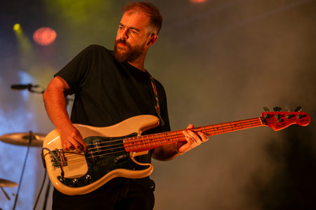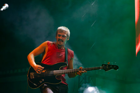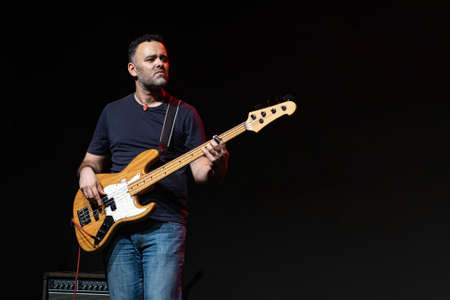 Man guitarist bass guitar instrument performing at stage rock music. Scene outdoor light. Authentic shooting with high iso in challenging lighting conditions.