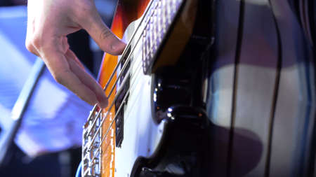 The musician plays the electric bass guitar on stage. Guitar neck close-up on a concert of rock music in the hands of a musician. Fingers on fretboard. Guitar neck close-up on a concert of rock music in the hands of a musician. Fingers on fretboard