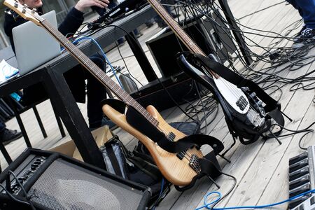LVIV, UKRAINE - June 18, 2019: rock band concert preparation. equipment view
