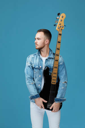 handsome man in denim holding guitar isolated on blue background