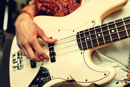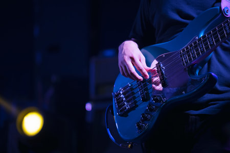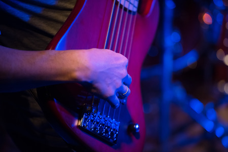 Detail of a musician playing on a bass guitar at concert