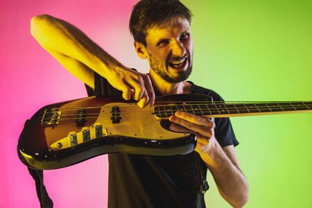 Close up young and joyful caucasian musician playing bass guitar on gradient studio background in neon light. Concept of music, hobby, festival. Colorful portrait of modern artist. Inspired improvising.