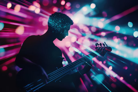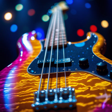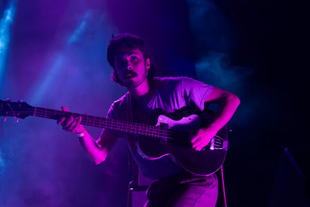 A musician plays the bass guitar under colorful stage lights, creating an energetic performance vibe.