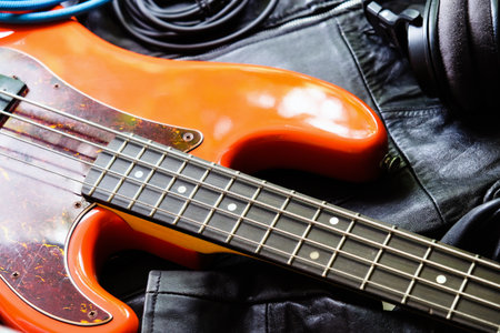 Electric guitar on a black leather jacket with headphones and blue cable.