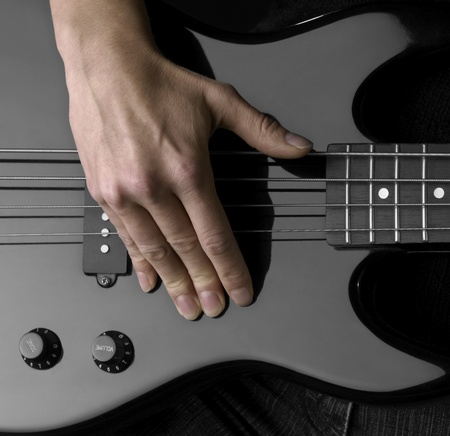 female hand on the detail of a black bass guitar in dark back