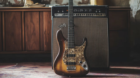 A bass guitar placed vertically with amplifier behind