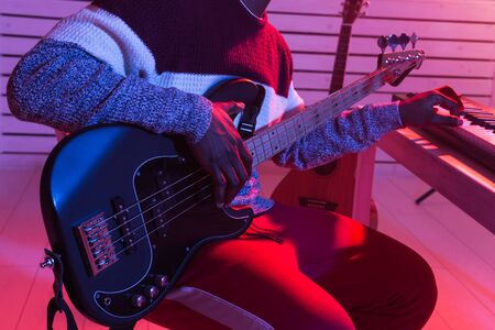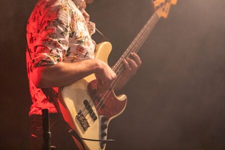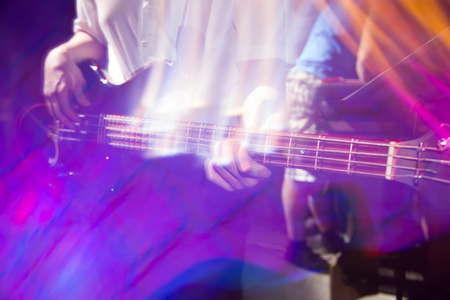 Guitarist bass on stage for background, colorful, soft focus and blur
