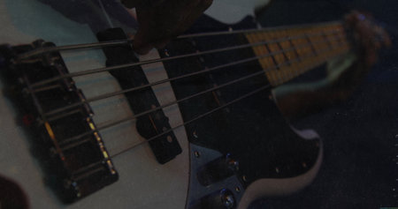 Close-up of a man playing the bass guitar.