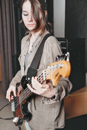 young woman wearing casual clothes and playing electric bass guitar. female bass guitarist standing in a rehearsal room