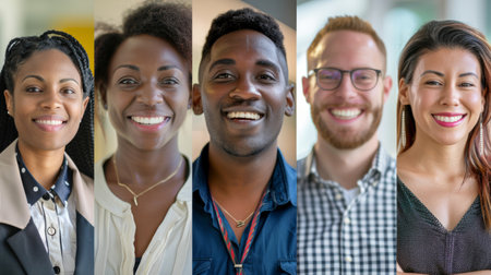 A collage presents a diverse group of individuals, all smiling with genuine expressions. The composition utilizes a split-screen effect, showcasing various people. The overall aesthetic suggests a bright and friendly atmosphere, possibly indicating collaboration or togetherness. Suitable for commercial projects.