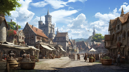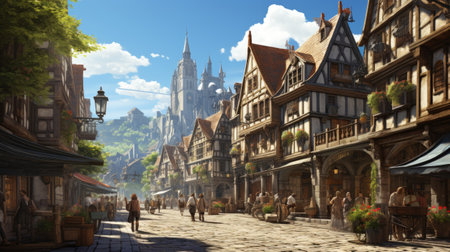 Generative AI Photorealistic 3d illustration of an European medieval street on a sunny day. Fantasy
