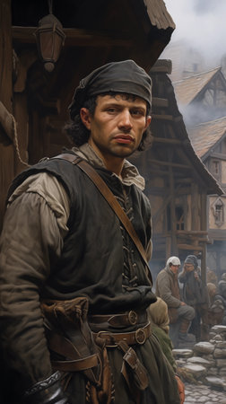 Townspeople walking down a medieval town street on a rainy day. Ai generated