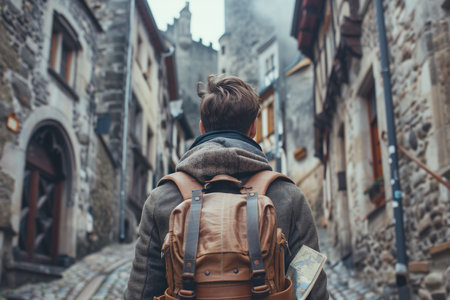 A man with a backpack and map traverses a medieval alley in Europe, exploring its heritage