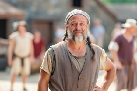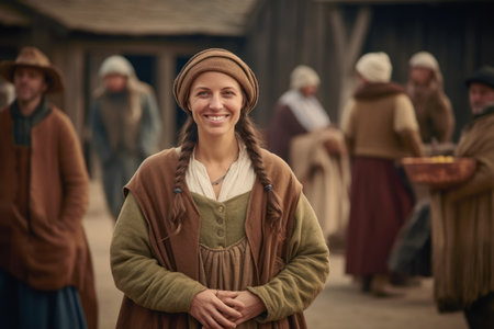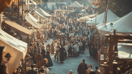 Defocused scene of a medieval marketplace with actors in authentic costumes