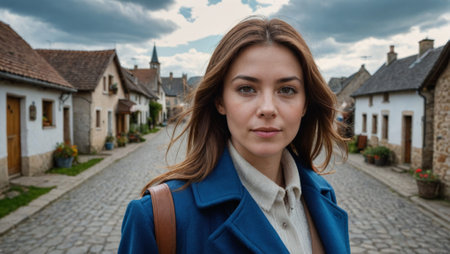 Woman in Blue Coat Strolling Through Quaint Village