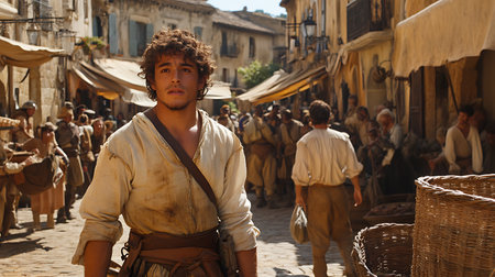 A man with a beard and a wide-brimmed hat standing in a bustling market street filled with warm sunlight and blurred background of people and shops