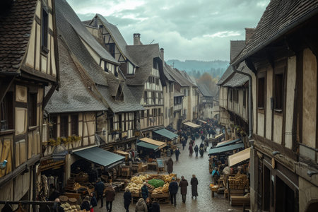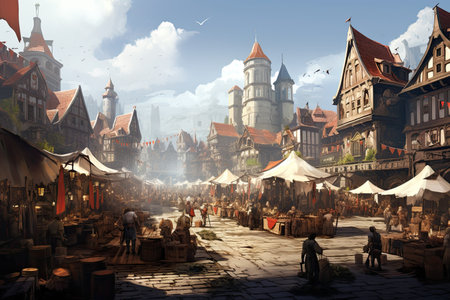 Medieval village with stone houses, cobbled streets, and market stalls for a rustic backdrop