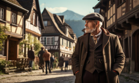 An elderly man in a hat and coat walks down a quaint village street, surrounded by charming old buildings. The scene captures a peaceful moment in a picturesque setting.
