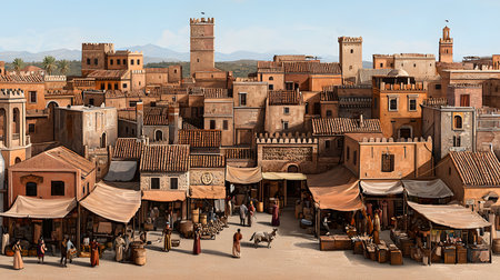 Crowded Medieval Marketplace in a City With Tall Buildings
