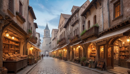 A serene early morning setting captures a picturesque cobblestone alley flanked by quaint stone buildings with warm lighting from storefronts, hinting at a bustling day ahead.. AI Generation