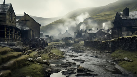 A picturesque village nestled in a valley, with stone cottages and a river running through it